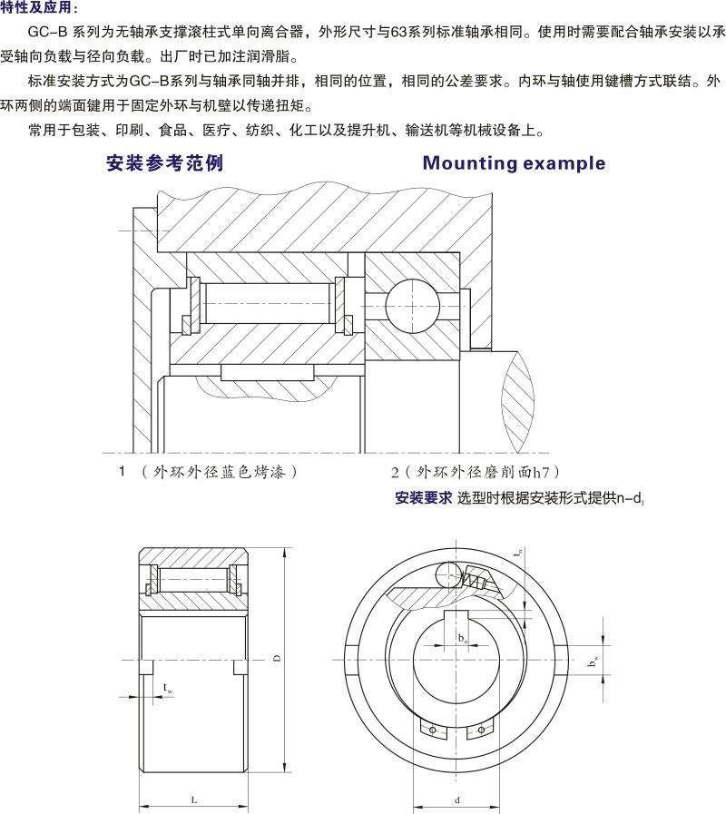 GC-B系列為無軸承支撐滾柱式單向離合器,外形尺寸與63系列標準軸承相同。