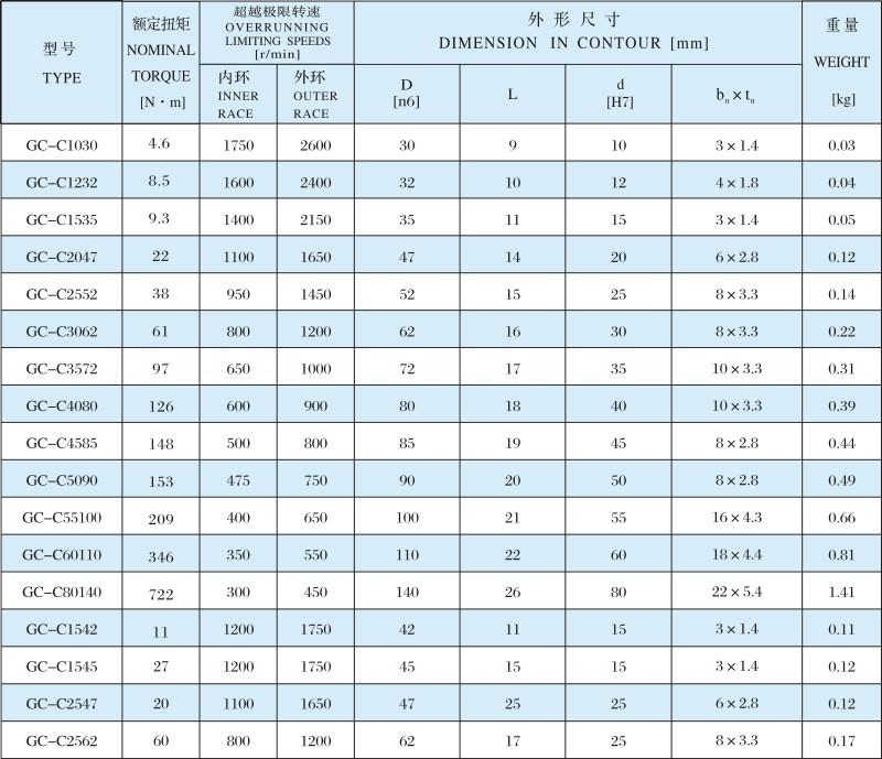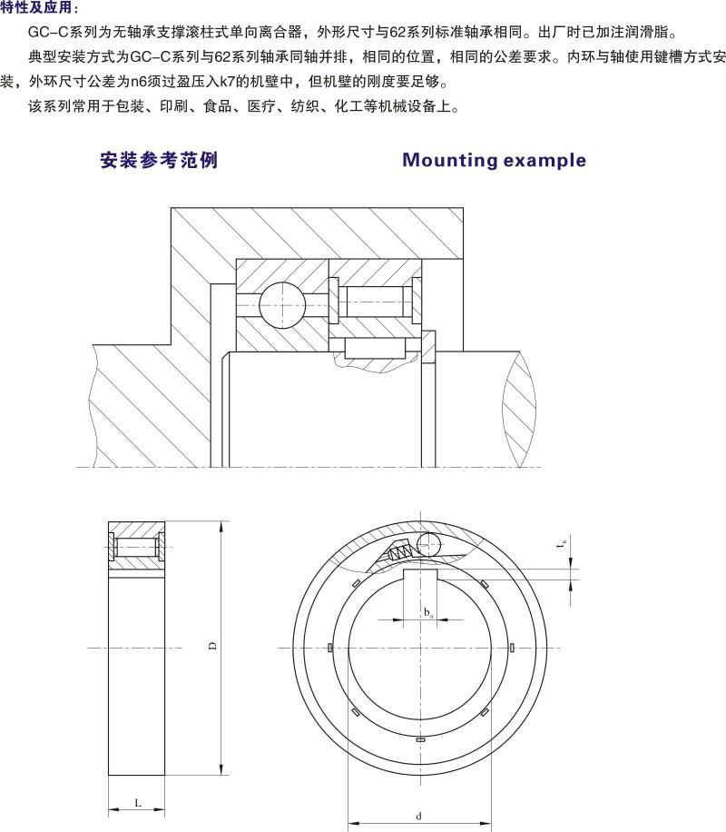 GC-C系列為無軸承支撐滾柱式單向聯軸器,外形尺寸與62系列標準軸承相同。
