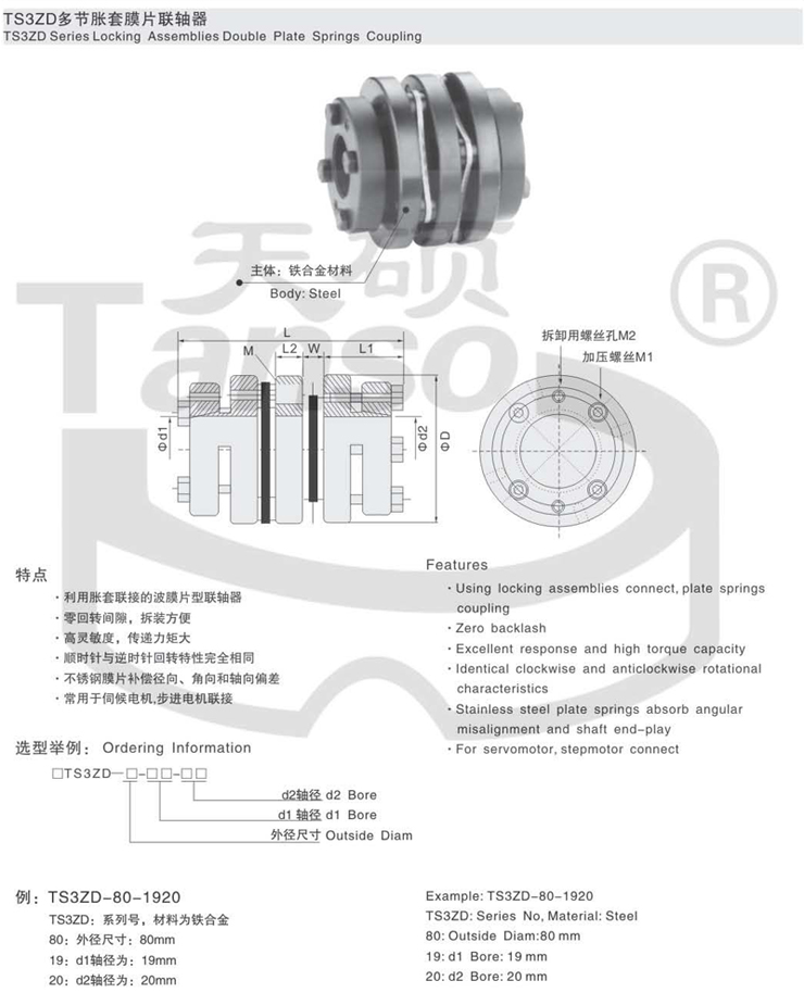 TS3ZD多節脹套膜片聯軸器,精密聯軸器,天碩聯軸器官網,特 點:1.膜片型彈性聯軸器2.高靈敏度、高扭矩剛性3.零回轉間隙4.順時針與逆時針回轉特性完全相同.