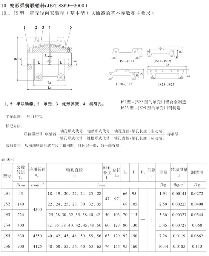 蛇形彈簧聯軸器,是一種結構*的金屬彈性聯軸器,它靠蛇形彈簧片來傳遞扭矩,蛇形彈簧聯軸器是當今國際機械領**的軸聯接傳動部件,也是一種非常通用的軸聯接傳動部件蛇形彈簧聯軸器共有九類型式,分別是JS罩殼徑向安裝型(基本型)蛇形彈簧聯軸器、JSB罩殼軸向安裝型蛇形彈簧聯軸器、JSS雙法蘭聯接型蛇形彈簧聯軸器、JSD單法蘭聯接型蛇形彈簧聯軸器、SJS接中間軸型蛇形彈簧聯軸器、JSG高速型蛇形彈簧聯軸器、JSZ帶制動輪型蛇形彈簧聯軸器、JSP帶制動盤型蛇形彈簧聯軸器、JSA安全型蛇形彈簧聯軸器等。